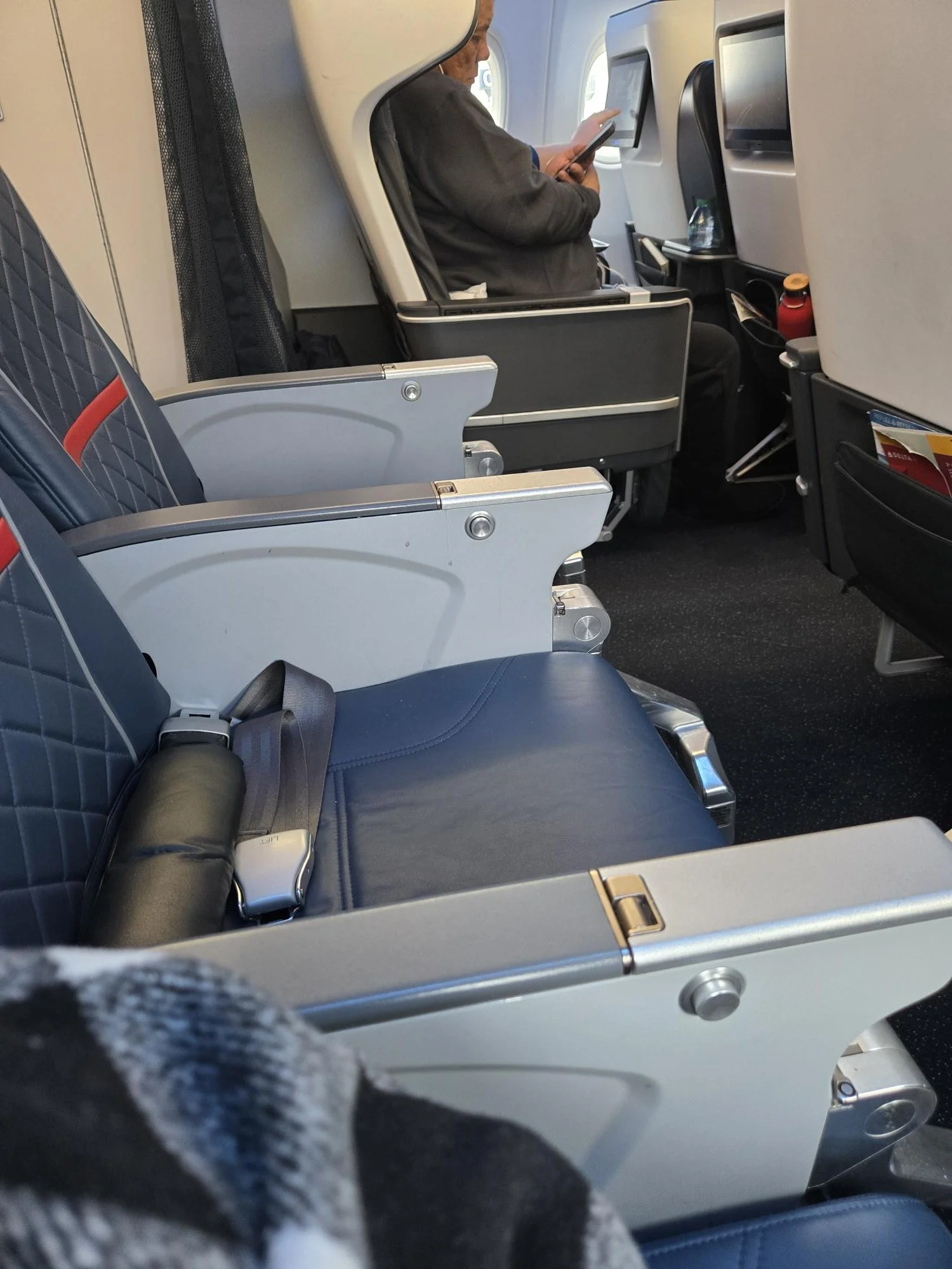 We had the entire row to ourselves. No seatmate. No competition. The restroom was across the aisle, and when I glanced forward at the first-class seats, I realized something important.